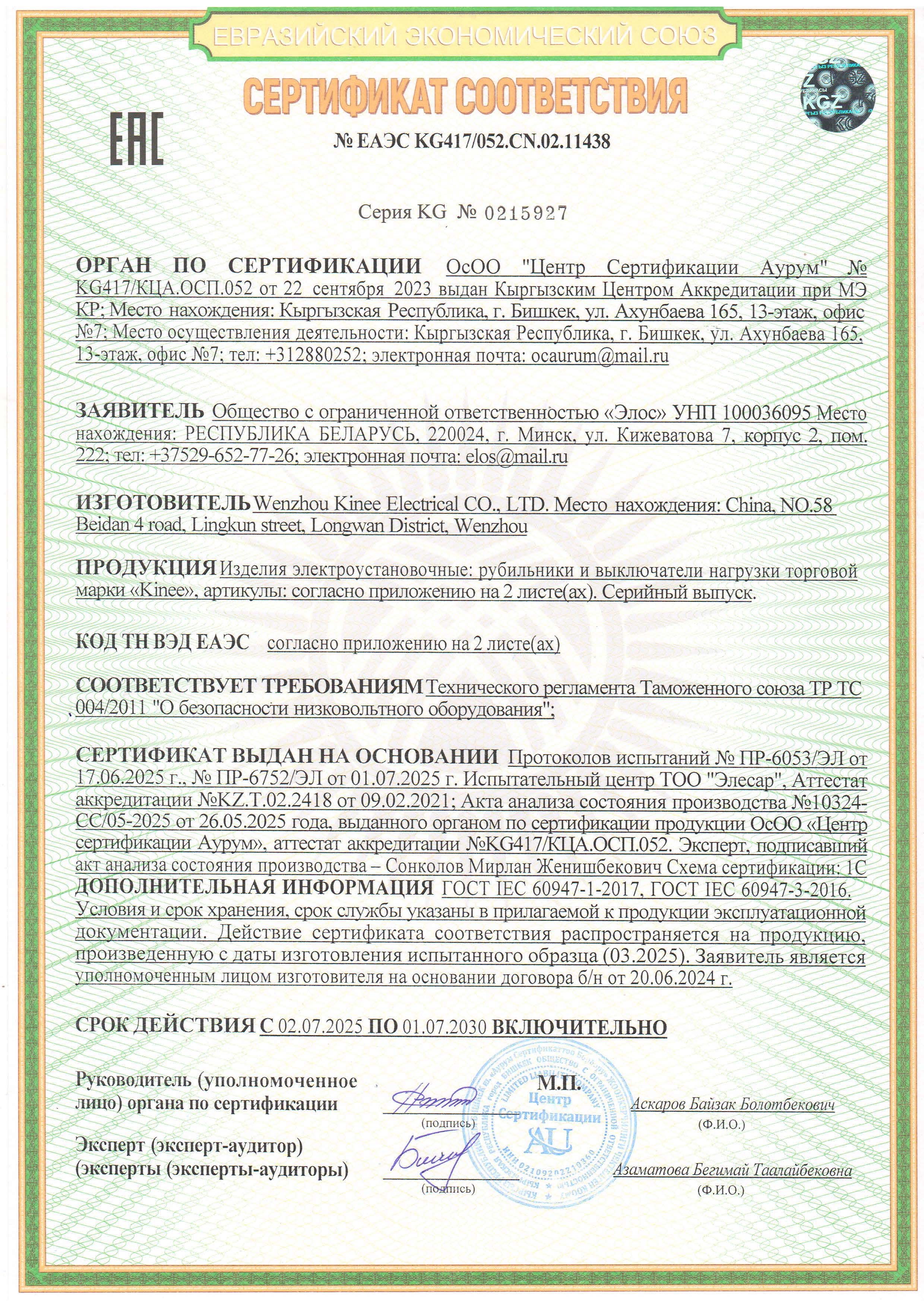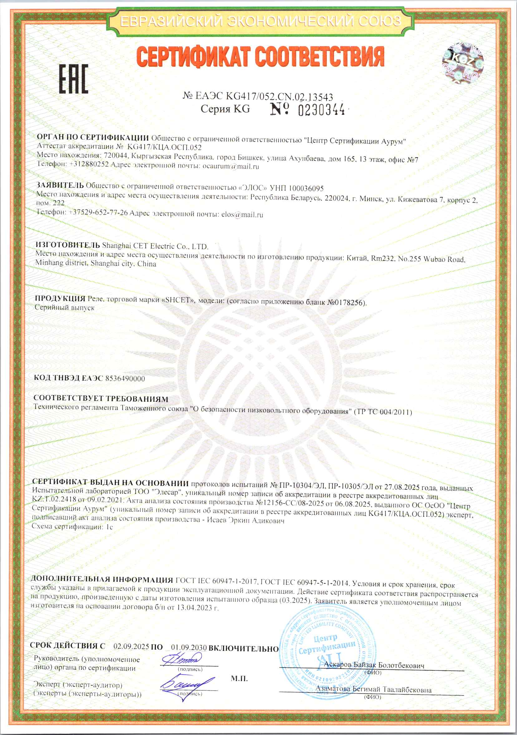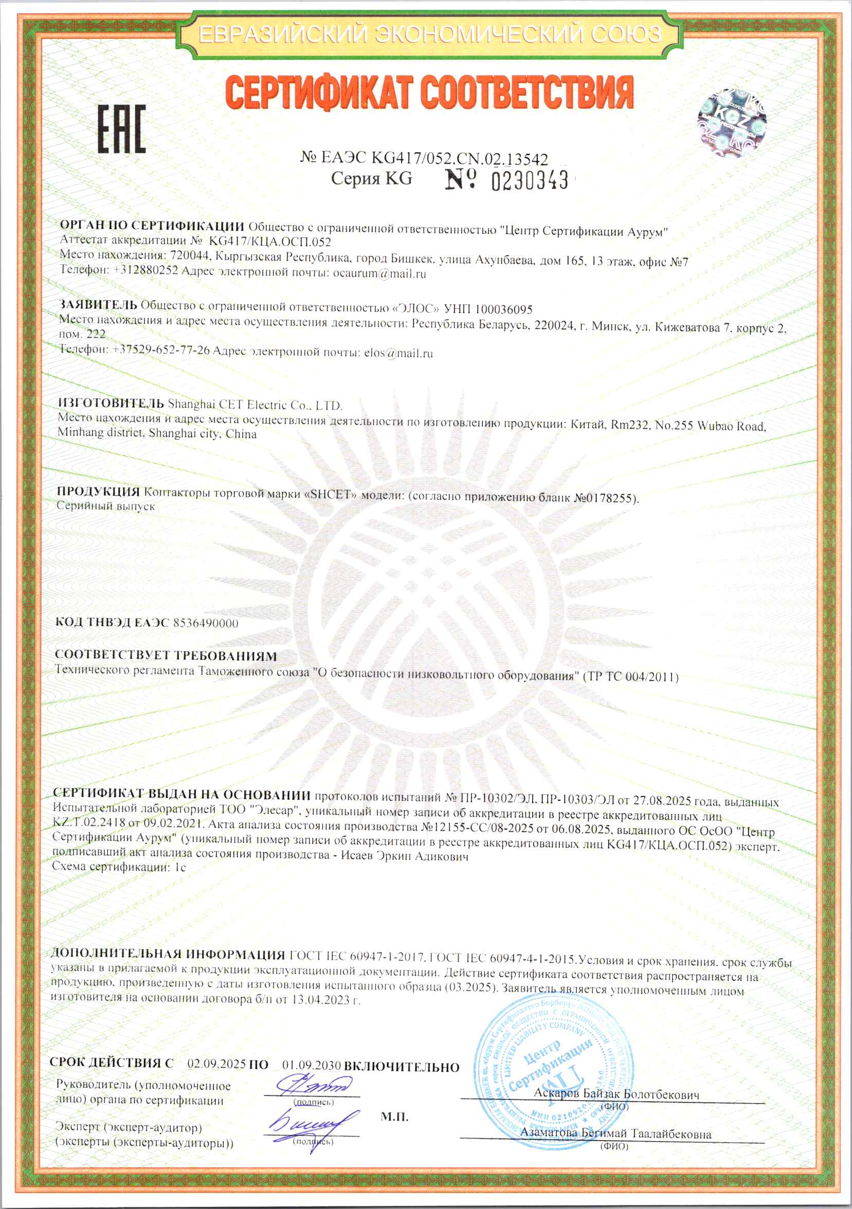 Сертификаты ООО "Элос"